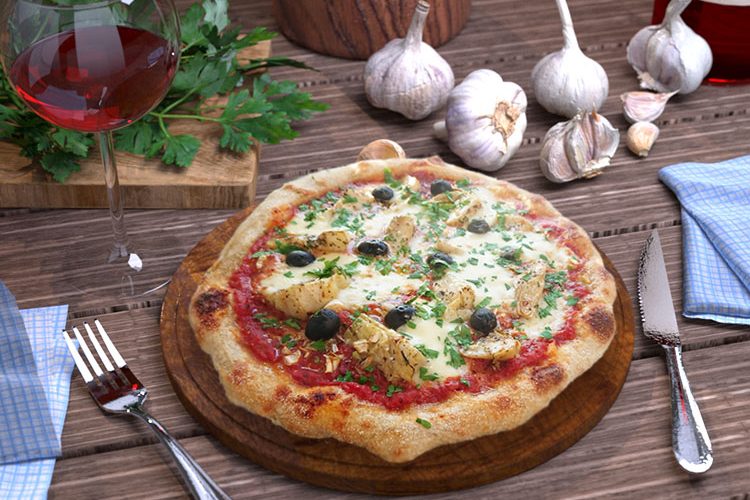 1/2 Portion Klassischer Pizzateig (nur eine Teigkugel zubereiten), 100 g Büffel- oder Kuhmilch-Mozzarella, 100 g Artischocken (in Öl), 1-2 Knoblauchzehen (fein gehackt), 2 El
