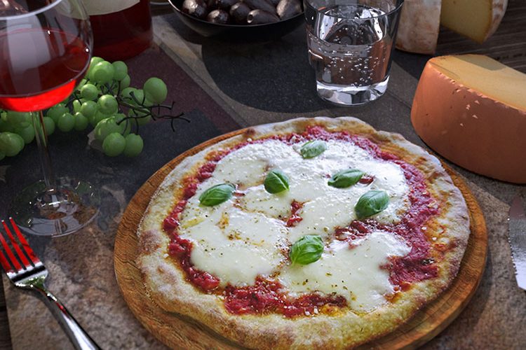 1/2 Portion Klassischer Pizzateig (nur eine Teigkugel zubereiten), 50-75 g Büffel- oder Kuhmilch-Mozzarella, 3-4 El Pizzaiola-Sauce, 200 stückige Tomaten (aus der Packung), 1 Handvoll