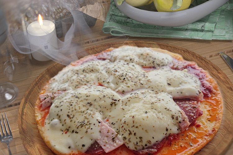 Für den Teig: 1 Ei, 5 El Mehl, 4 El Schmand, 1 Prise Salz Für den Belag: etwas fertige TomatenSauce, etwas geriebenen Käse,