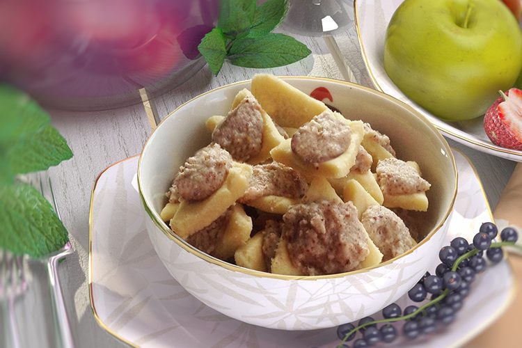250 g Mehl, 100 g Puderzucker, 2 Eigelb, 1P. Vanillezucker, 100 g Butter, 30 g Rosinen, 1 El Rum, 2 Äpfel, 1 Msp. gemahlener