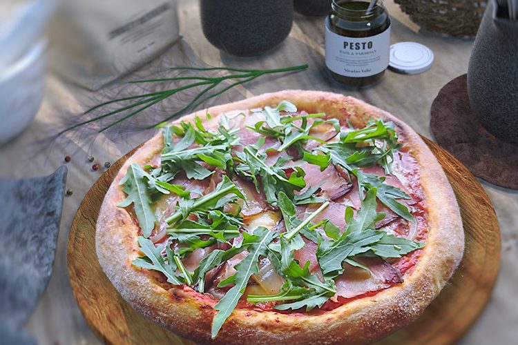 Teig: 1 Kg Mehl, 1 Priese Zucker, 1 Priese Salz, 1 Päckchen frische Hefe, ca. 650 ml lauwarmes Wasser, etwas Öl (für das Backblech)